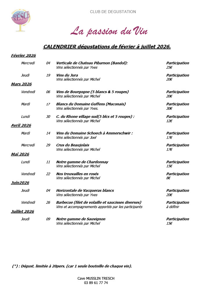 Retrouvez ci-dessous le calendrier des prochaines dégustations